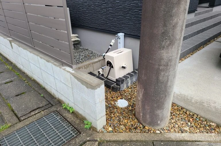 少し見づらいですが、立水栓下はユニット式のガーデンパンではなく石を詰んだ作り付けのガーデンパンを施工しています(^^)