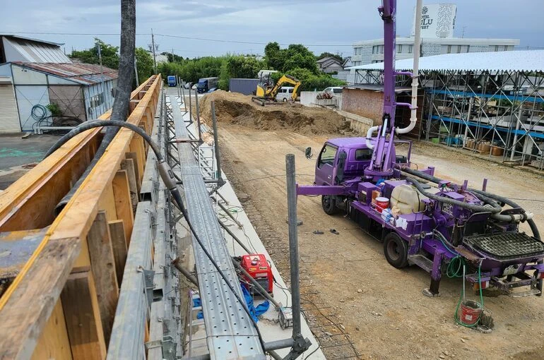 ミキサー車は生コンを運ぶだけの車なので、ミキサー車から出てくる生コンを打設する場所まで運ばなくてはなりません。
