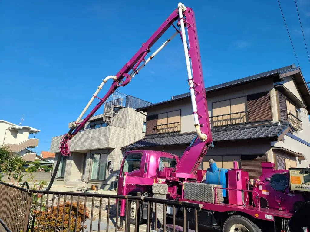 外構工事では1輪車やシュート(生コンを流しそうめんのように流す道具)が良く使われますが高低差があったり、ミキサーから距離がありすぎる場合はポンプ車を使用します😊