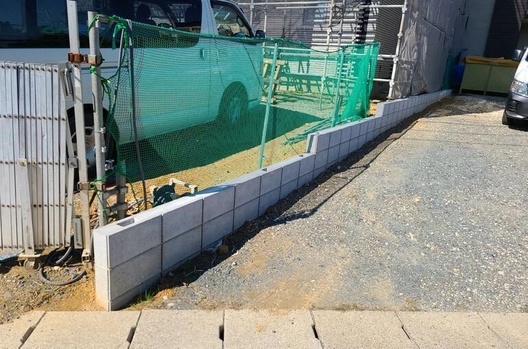 この土地は傾斜が結構きつかったので境界ブロックを少し変わった作りにしました(^^)