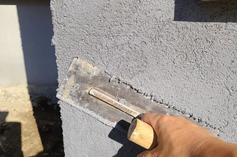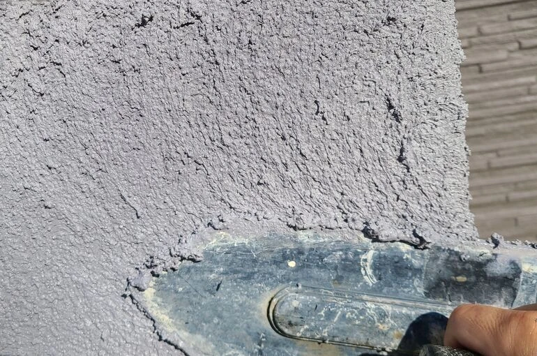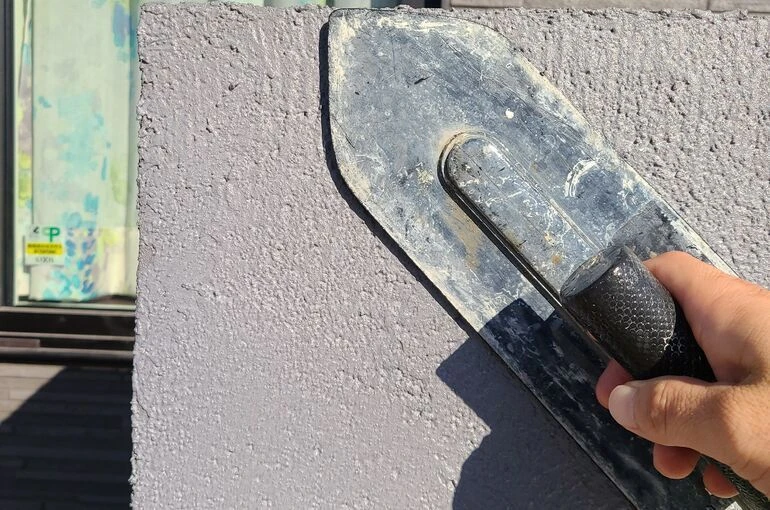 扱き塗りが終わったらジョリパットに骨材(少し粗めの砂のようなもの)を入れて良く撹拌して塗りつけていきます。