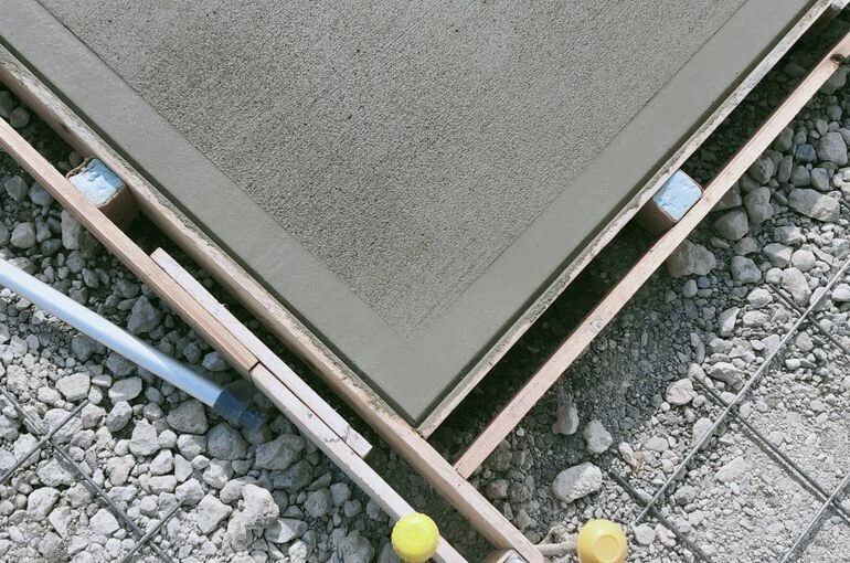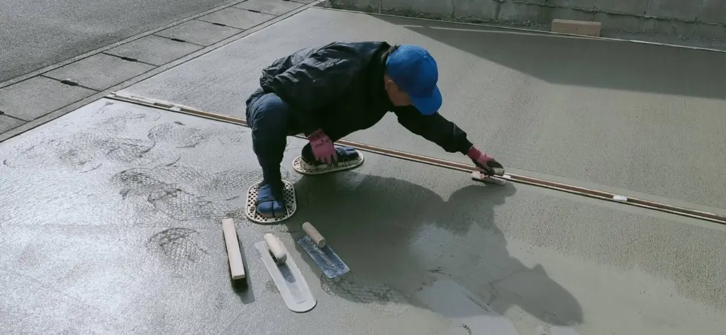 この写真では木ゴテと呼ばれるコテを使ってコンクリート表面に現れた細かいムラを取り除いています。