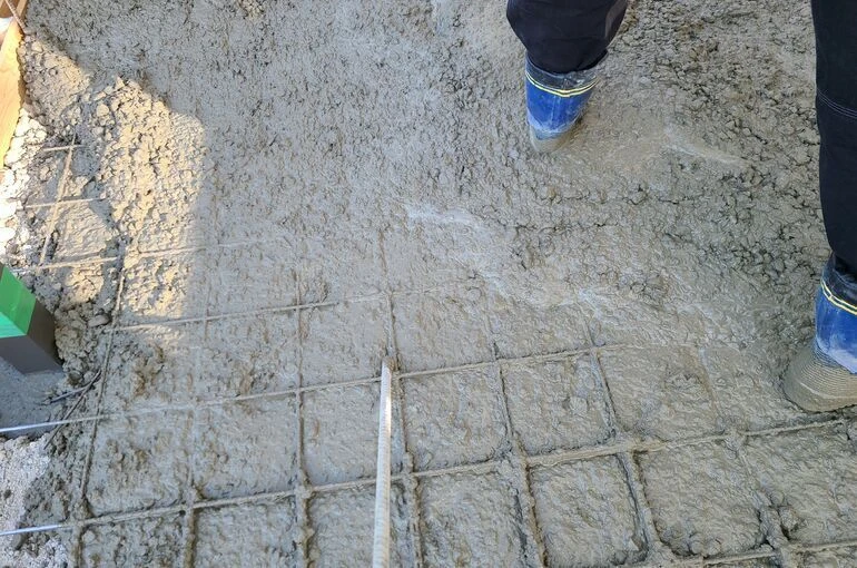 ワイヤーメッシュを上げながらコンクリートを打ち込んで、トンボで荒打ちと呼ばれる状態にしていきます!