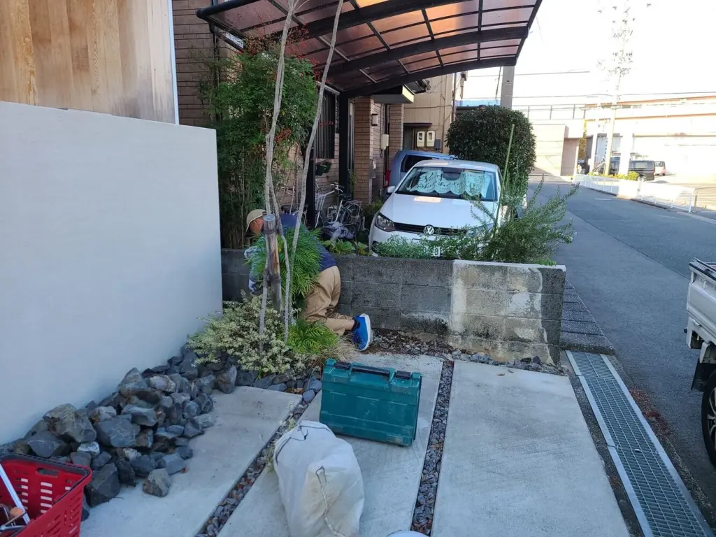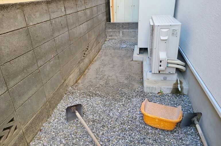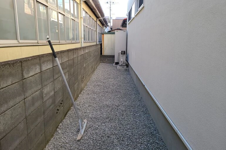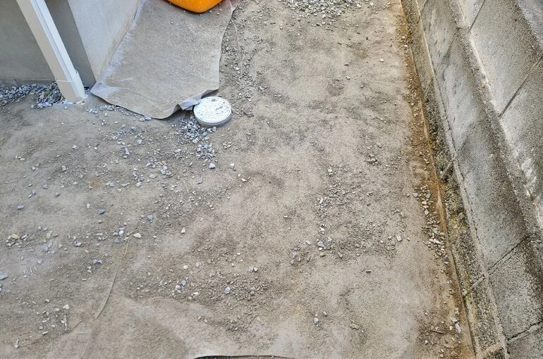 砂利の下に新築の外構で施工された防草シートが施工してありますが、そこまでいいものではなく、施工もあまり綺麗とはいえません。