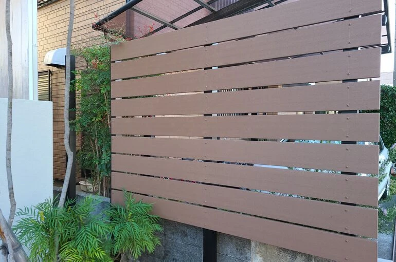 木粉入りの樹脂フェンスなのですが季節によって収縮するためビスを打ち込む部分にはビス穴よりも少し大きめの下穴をあけて施工しています。