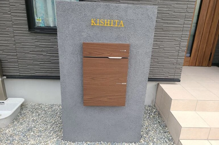 外壁に色を合わせて表札は黒の門袖に映えるように金色の表札にしました!