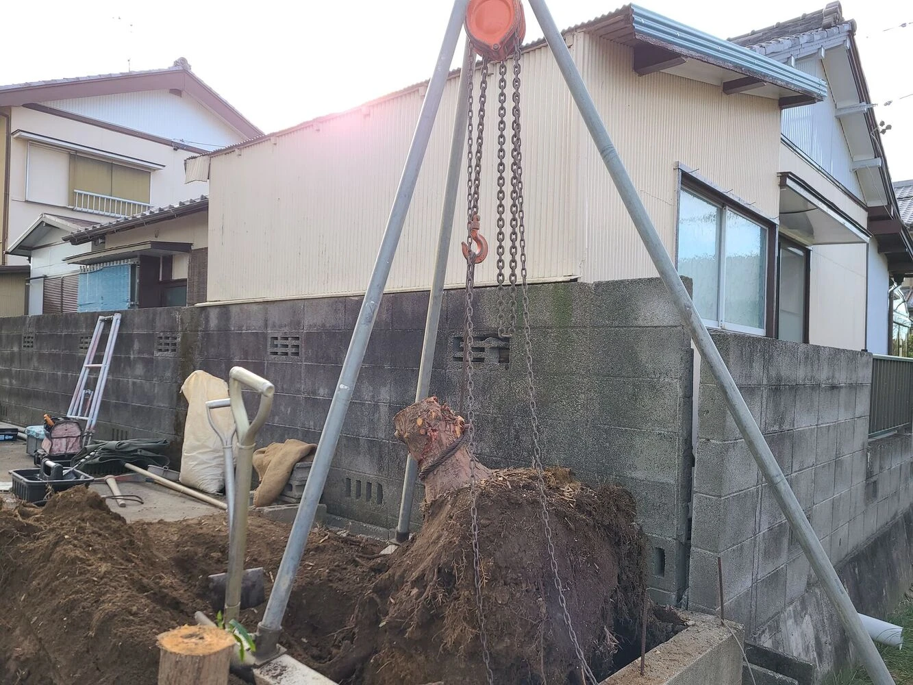 抜根する際には少し幹を残さないとワイヤーが上手くかからないので幹を少し残してあります。