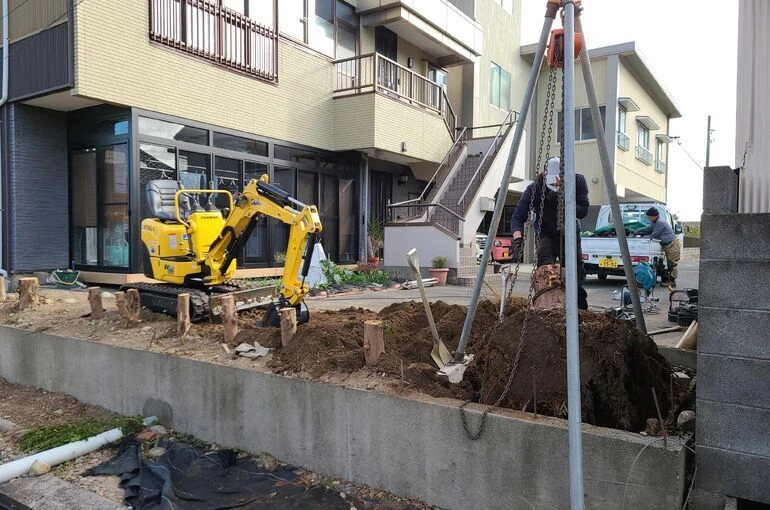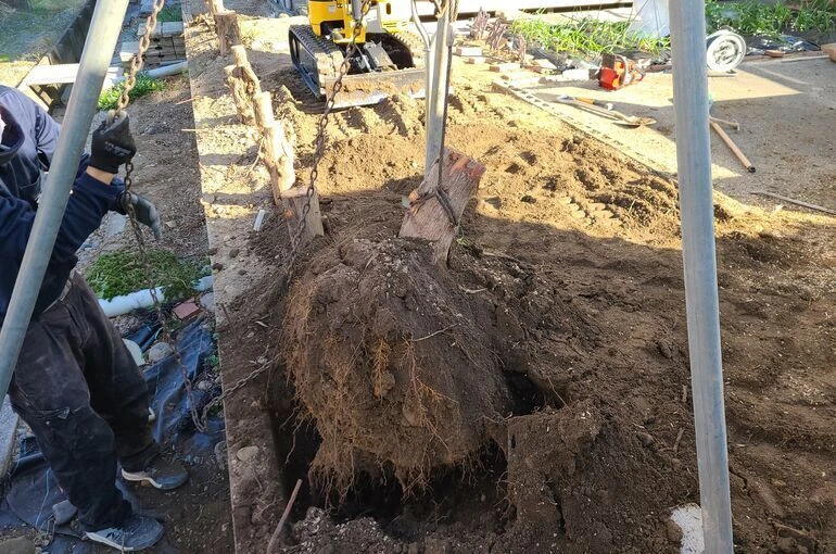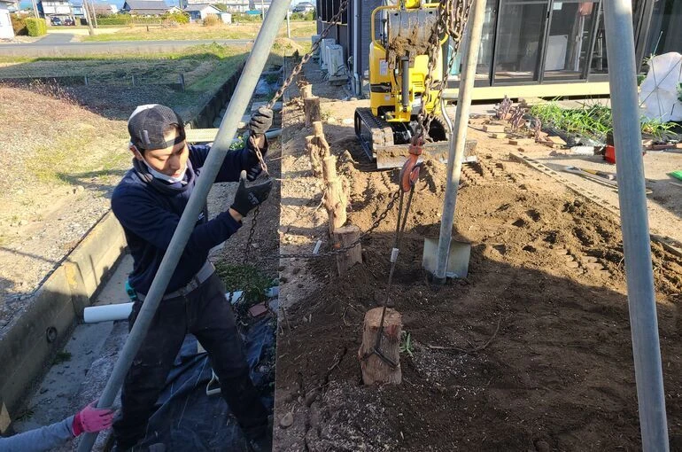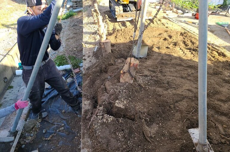 先日伐採した木の切り株を抜く作業(抜根)です!