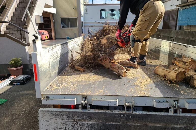 幹と根では処分費用が異なるため綺麗に分別するためにダンプの上でチェーンソーで幹と根を切り分けます。