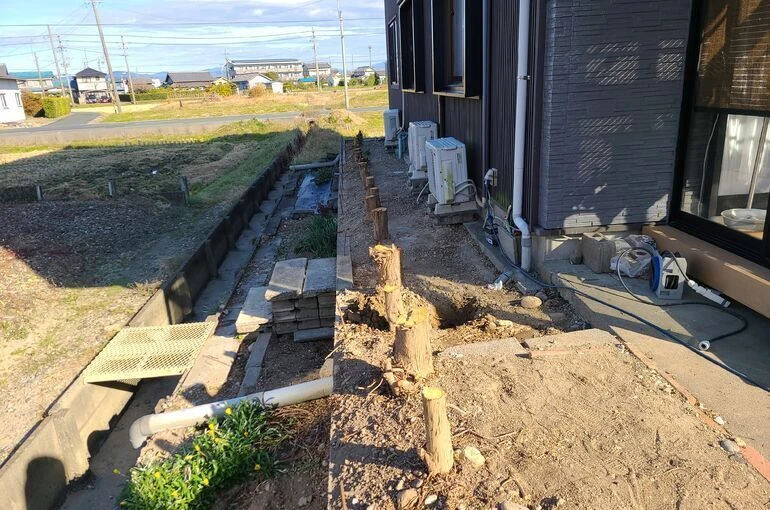 今回の現場は作業スペースがとても狭く、重機も半分しか入れないため大分手こずっています💦
