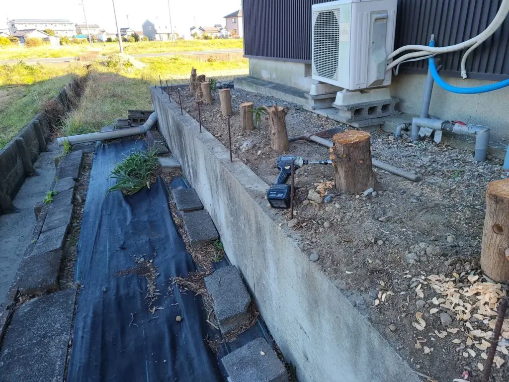 樹木の抜根作業がやっと終わって清掃、片付け後に既存の擁壁の上にアンカーを設置する工事をしました。