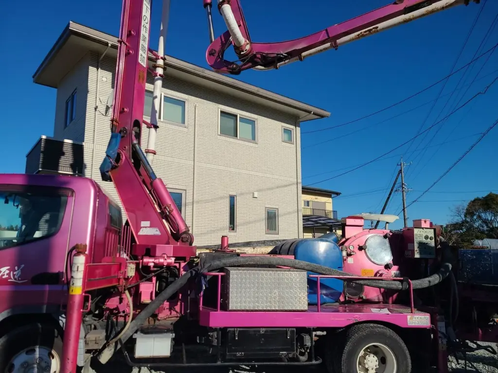 ミキサーのお尻をポンプにくっつけて打設していきます(^^)