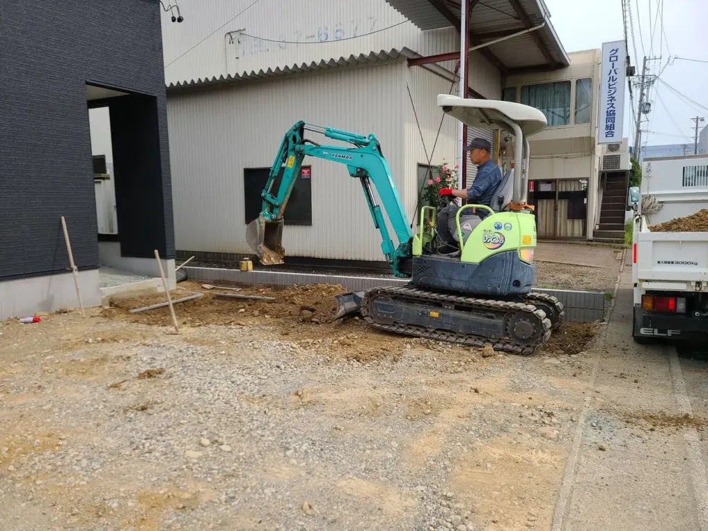 カーポートの柱の位置に規定の大きさの穴を掘って、型枠で柱の部分だけを抜いていきます(^^)
