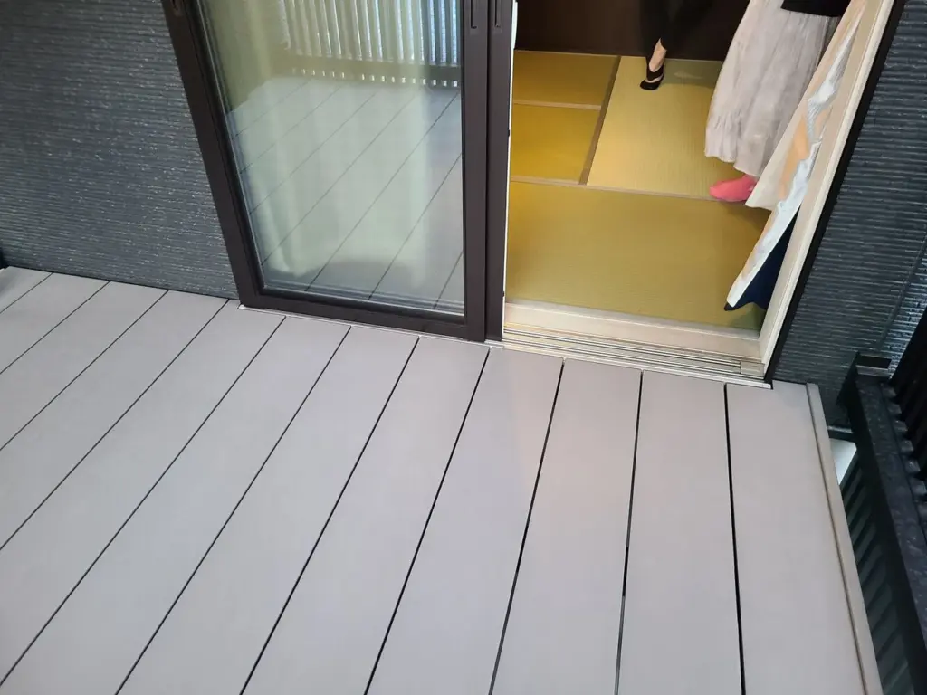 通常の外構の場合はサッシの下にウッドデッキの床板を差し込むような形で施工するのですが、今回はバリアフリーサッシだったのでサッシの部分を上手く切り欠いて施工してます!