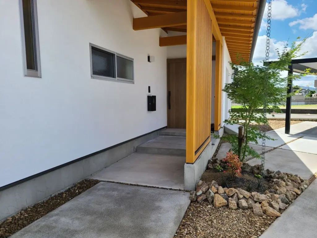 普通のお宅だと家の直下に合わせてエクステリアを作るのですがあえて常識に囚われず道路からの直角で外構を作って遊び心溢れるエクステリアになりました!