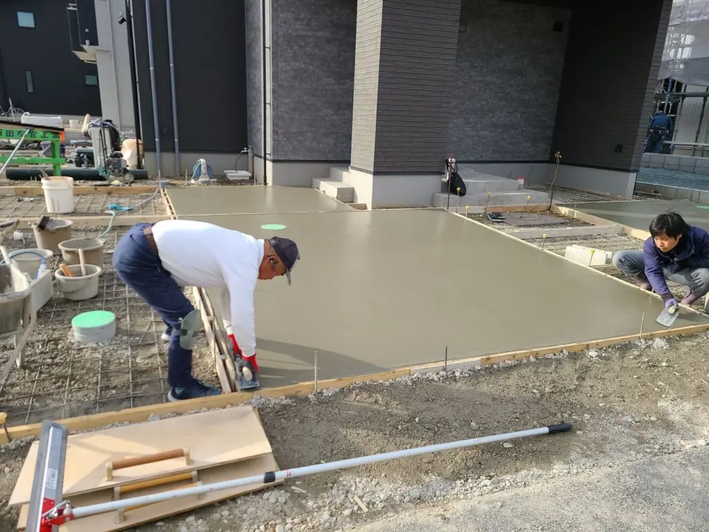 弊社では刷毛跡をつけるタイミングも場所ごとに使い分けていて、人が歩くだけの場所は細かめにするようにコンクリートがより固まってから刷毛引きをし、駐車場は逆にタイヤで削られてしまうため少し早めに刷毛引きをします(^^)