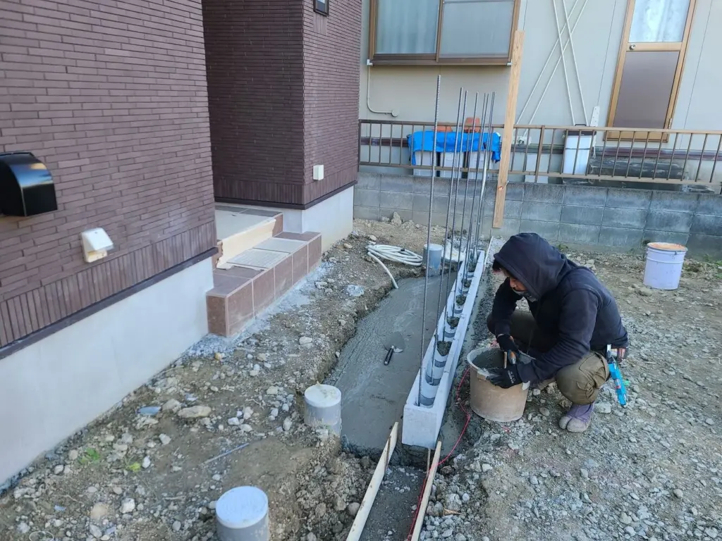 門袖のブロックの幅を途中で変えて、アクセントにタイルを張り付けるようにしてあります(^^)