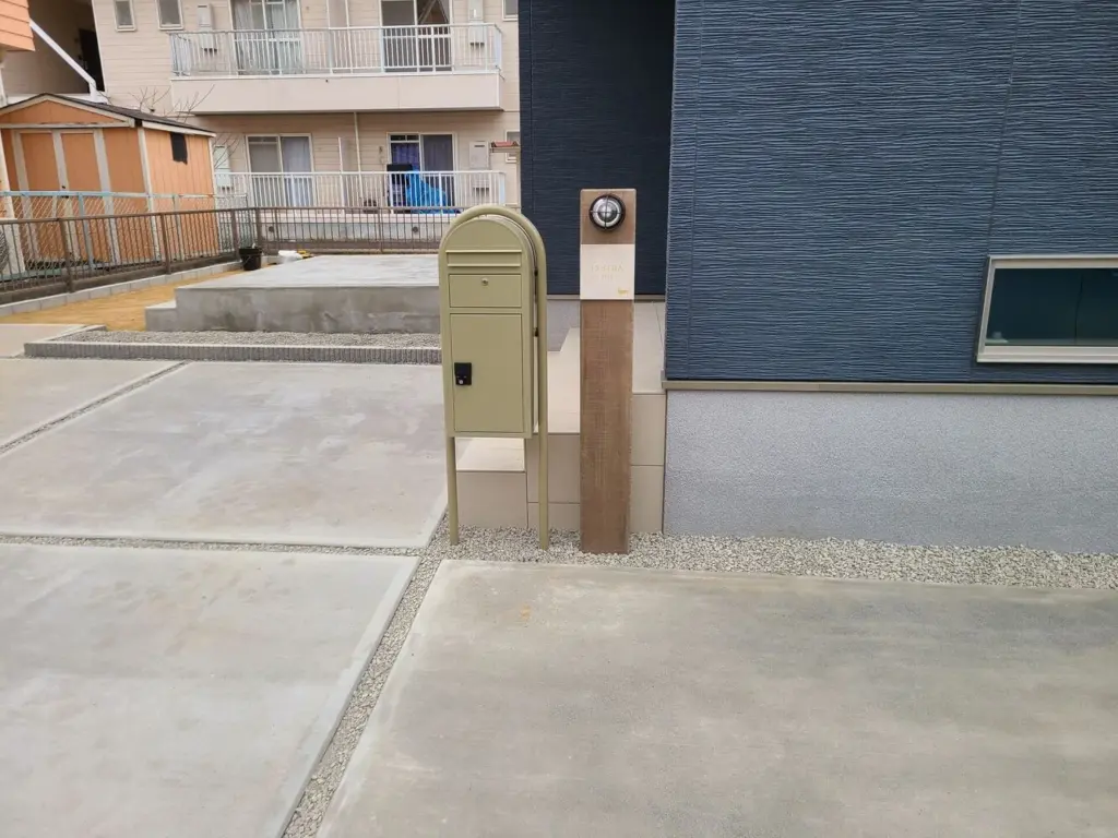 人気の北欧のポスト付き宅配ボックスのボビカーゴとお客様のご希望で採用した東洋工業の擬木枕木がとても素敵です😊
