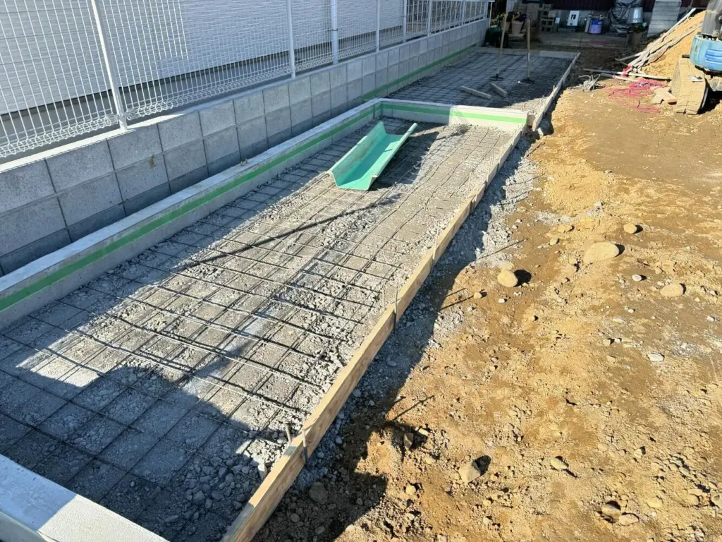 浜名区高畑にて第2期工事でガレージ基礎と物置きしたのコンクリート準備を行いました‼️