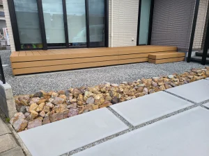 この事例では、庭の一角に広いウッドデッキが設置されました。ウッドデッキの上にはテーブルやチェアが配置され、家族や友人との集まりやリラックスタイムに最適な空間が作られました。ウッドデッキは木の温もりを感じられるため、自然と調和した雰囲気を醸し出しています。
