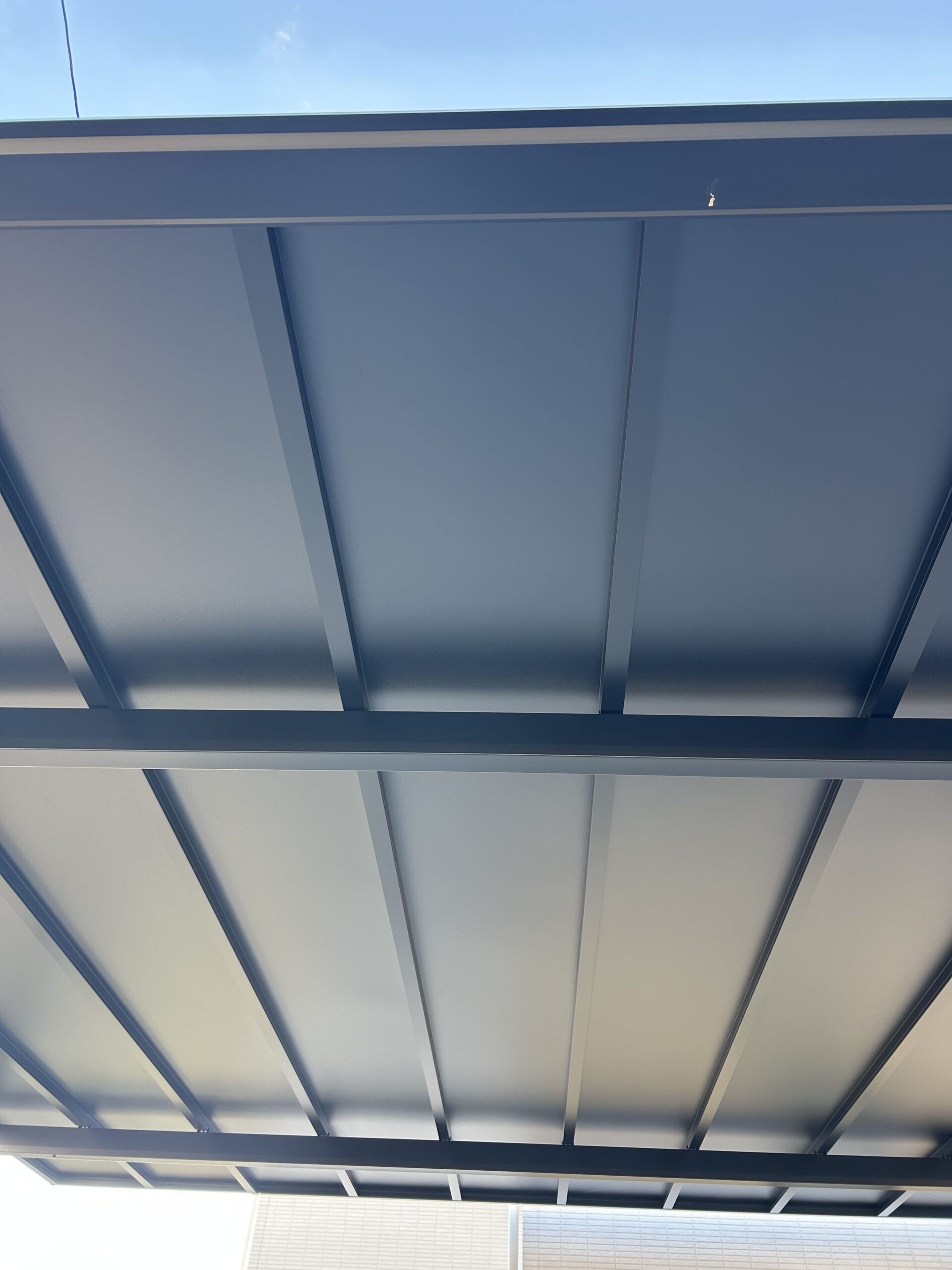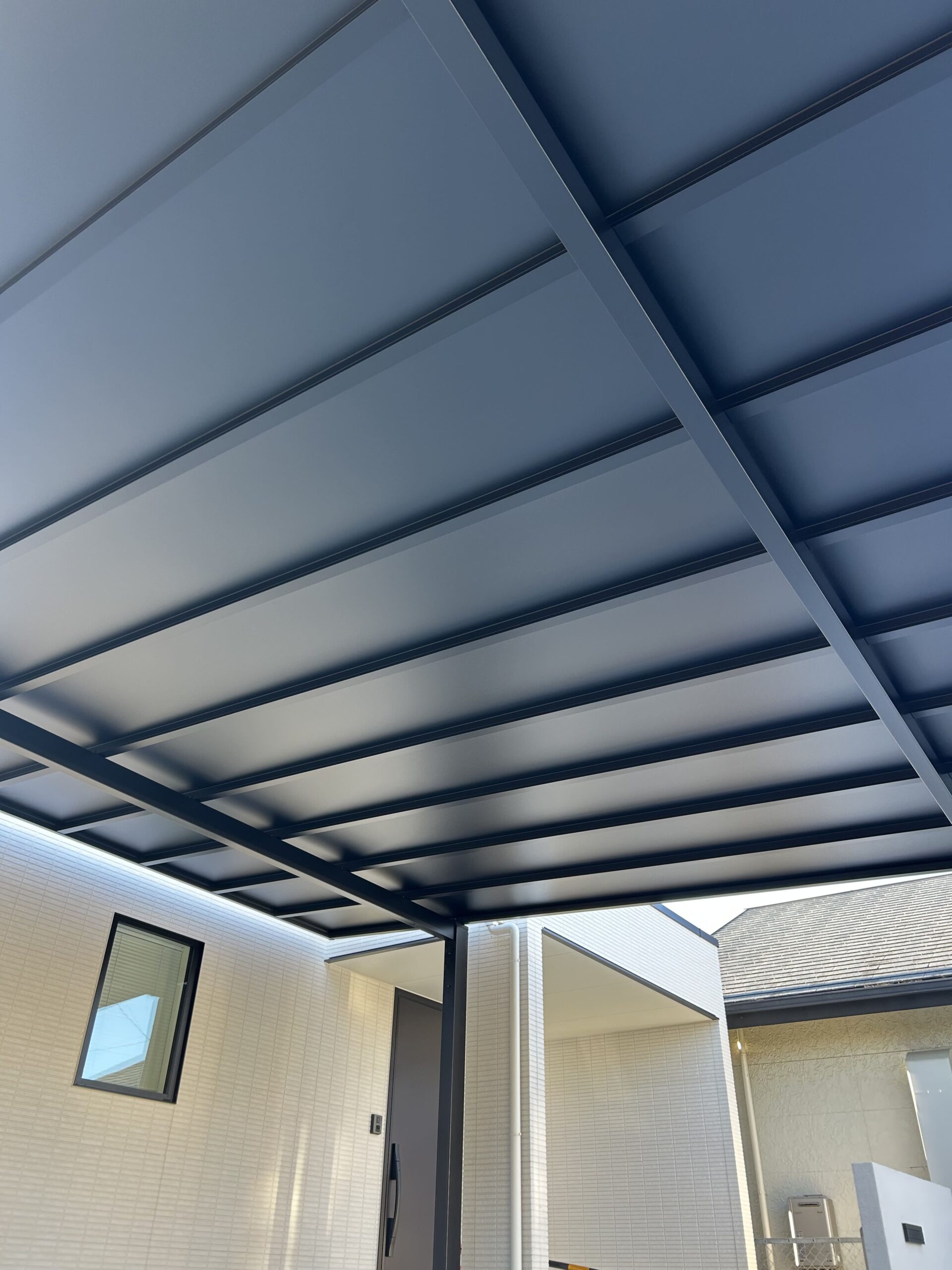 浜松市のK様邸で、三協アルミのカーポート「スカイリード(6058H25)」を設置しました。カーポートの屋根と家のひさしを被せることで雨に濡れにくい動線を確保。車2台をゆったり駐車できるサイズで、夏の強い日差しや急な雨から大切な愛車をしっかり守ります。屋根材はブラックポリカーボネートを採用し、紫外線を完全にカット。奥行、間口共に最大サイズのため、ハッチバックをやドアの開閉スペースも十分確保でき、車を停めた後家に入るまでも雨に濡れない動線を確保しました。
